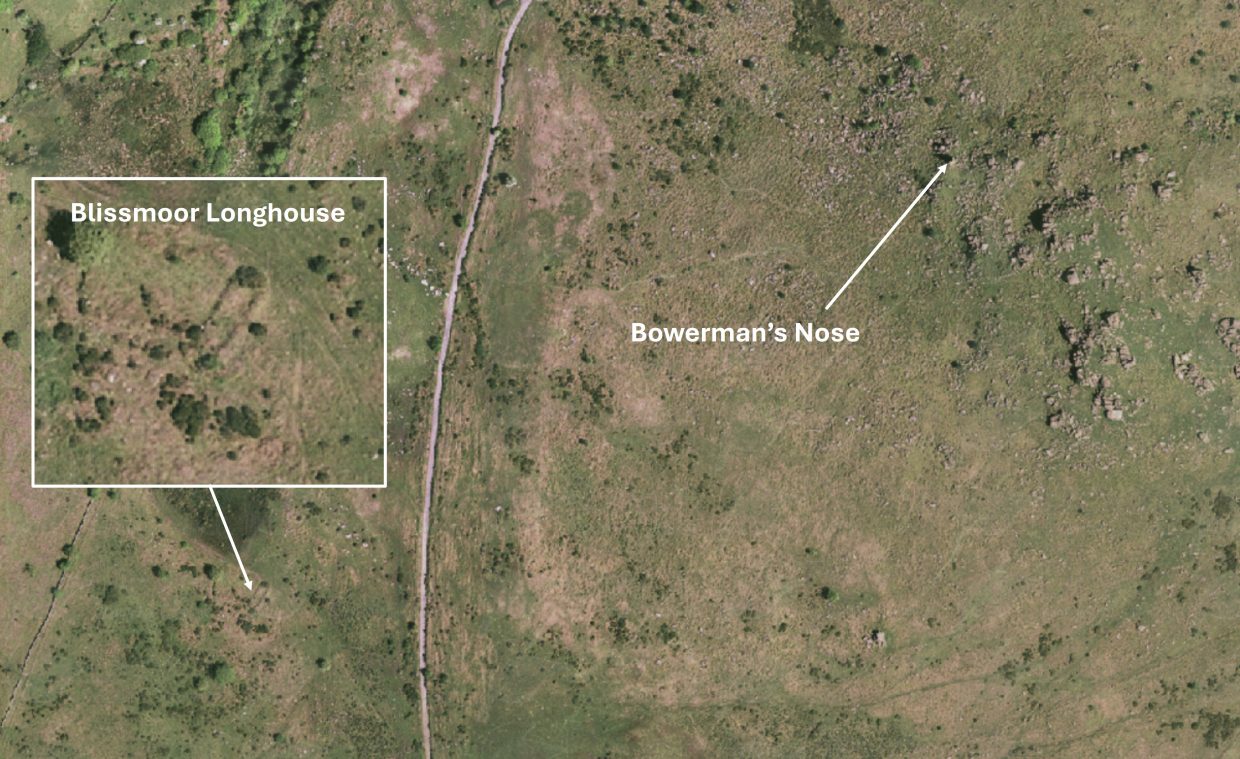 A lesser well known Longhouse near Blissmoor Farm is located close to the Swallerton Gate to Manaton Road, a few hundred metres to the south west of the well known rock pile of Bowerman’s Nose on Hayne Down. The name Blissmoor appears to have been first mentioned as ‘Blissmore’ in 1622 which post-dates the (Medieval) Longhouse.