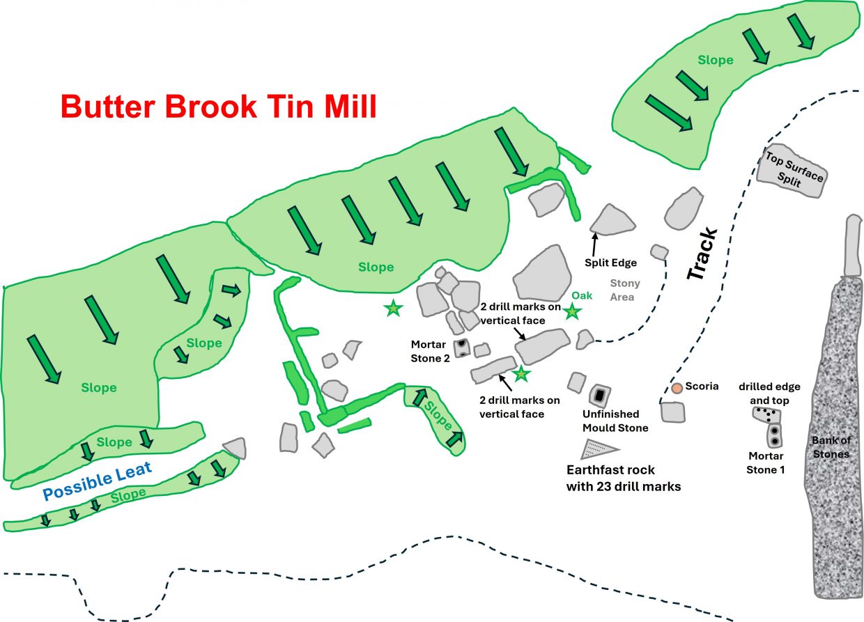 Waterfall on the Butter BrookTwo drill marks on a large block on the outer side of the Mill walling. Worth suggests these round holes were evidently sockets for the axle of some machinery. Worth continues (when discussing this Mill and others) that the axle might have been used as some kind of ‘fulcrum’ of some form of rocking beam or rollers of a flat-rod, and these may have worked the bellowsAnother drilled rock with adjacent Mortar Stone (1)Mortar Stone (1) with two very shallow depressions. This is located outside the millThis Mortar Stone (1) is located at SX64198 59212Rock with drill marks adjacent to the Mortar Stone (1)The stone has drill marks on its top and edgeUnfinished Mould StoneWorth records this partly formed mould as having dimensions of 13 1/2″ x 11 1/2″ and 1 1/2″ deep.Unfinished Mould Stone just a few metres from the north west side of the MillUnfinished Mould Stone was possibly a sample mouldA triangular ‘holed’ stone and unfinished Mould Stone beyondThis triangular stone full of holes is from circa 1916, when the building was used as a Smithy. The theories as to the use of this stone includes; where re-sharpened tools were tested, or where practising of drilling technique took place – the former is considered the most likely by the authorThe stone has 23 holes which are as recorded by the Ordnance Survey Archaeology Division around 2cm in diameter and circa 5cm deep. Worth believes ‘Jumpers’ were used on this stones. The triangular stone with the 23 holes was covered in moss when visited in February 2026Looking over the north east wall of the mill. The Mill is constructed from roughly-dressed dry walling of large stone 0.9 metres thick and up to 0.8 metres high (Ordnance Survey Archaeology Division)Tor Rocks Quarry 1 which is believed was served by the Smithy. The quarry is from 19th century and appears to have been worked in 1850-1860s (Hankin). That said, in a 2012 post (Dartmoor CAM) it is suggested that the quarry “was used only during the building of the (Butter Brook) reservoir”. The author has established that the reservoir was built circa 1915/6, but the quarries here appear on late 19th century maps and marked as ‘old’, so cannot corroberate the statement.Possible crane base at Tor Rocks Quarry 1 Tor Rocks Quarry 1 is located at SX6411 5912Tor Rocks Quarry 2 at SX6405 5904Of interest, in Tors Rocks Quarry 2 is that it was located at an important Devonian / other era geological interface. Darker veins of rock perhaps suggesting this (the author is no geologist!)
