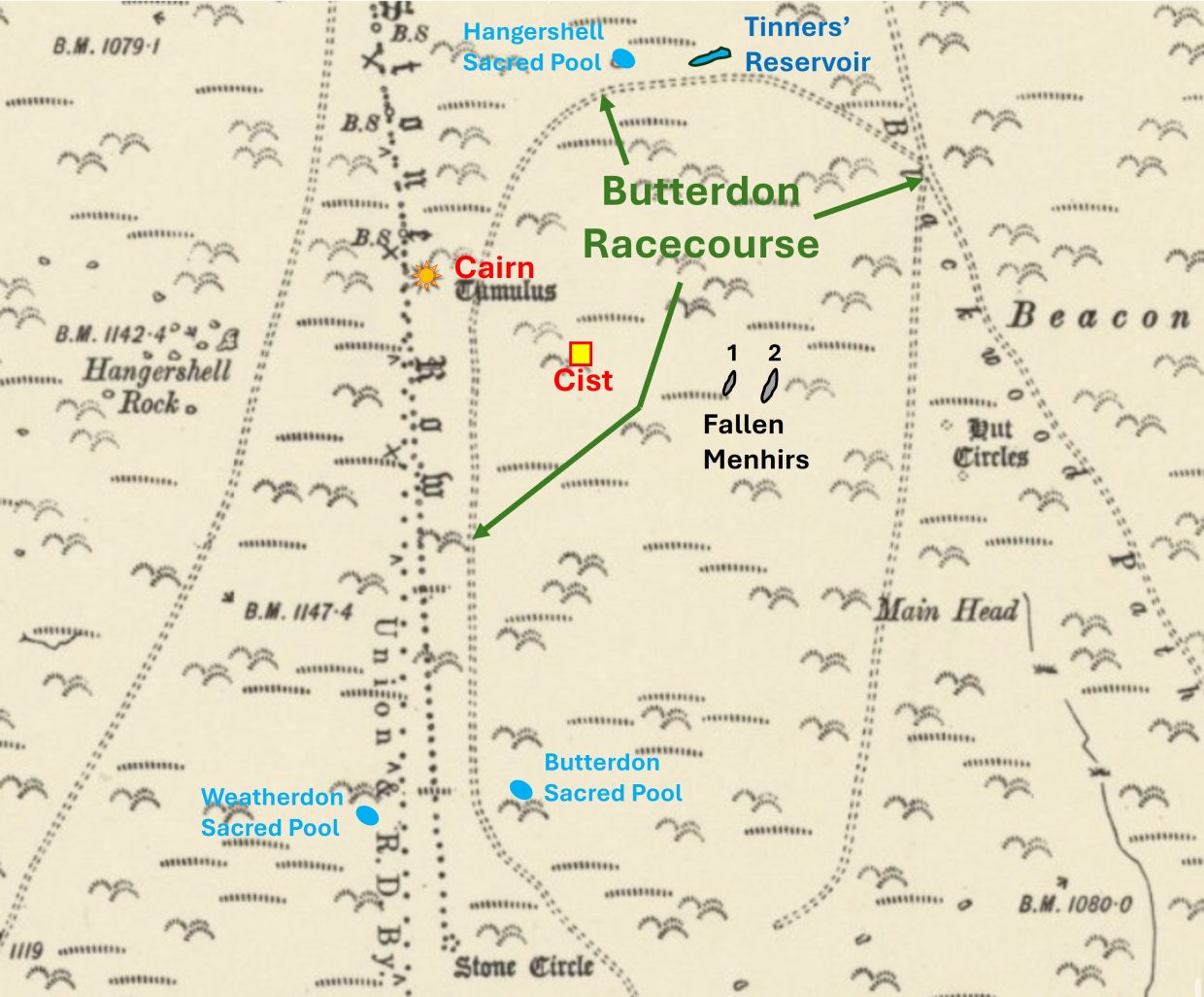 A large cairn (shown as a Tumulus on 19th century maps) is located on the east side of Butterdon Hill Stone Row. It is labelled as number 2 on the Butler map and measures 18m diameter by 1.5m high. In 2021, it was recorded that within the cairn there are the: “Remains of building in the centre of the cairn of 4.5m north to south, 6m east to west, defined by tumbled stone walls, 0.9m wide, 0.8m high, with entrance on east side. Probably associated with seasonal grazing” (Riley). The author can imagine that this cairn may well have been used as a vantage point when the 19th century horse racing was taking placeThe cairn is located at SX6566 5940Cairn with Hangershell Rock on the near horizon (right) and Weatherdon Hill cairns on the far horizon (left)Part of the Butterdon Hill single stone row close to the Race Course. The row is nearly 2km long between Butterdon Hill and Piles Hill. It is the second longest stone alignment on Dartmoor. Stones are recorded as being up to a metre in height and are spaced at intervals of 1 metre to 1.5 metres. A Tinners’ Reservoir which consists of a gorse-covered shallowly crescentic bank about 35 metres in length. Tom Greeves presumes the reservoir served tinworks on the Lud Brook to the south and is likely to be of 16th or 17th century date. The banking on the Tinners’ Reservoir is about 7m wide and 0.5m highThe Tinners’ Reservoir can be found at SX65872 59587Hangershell Sacred Pool measures 13m by 9.3m and is located at SX65824 59588. It is located 50m to the west of the Tinners’ Reservoir (whose earthbanks can be seen in the photograph)Butterdon Sacred Pool isa sub-rectangular shallow pit which measures 15m by 19m and is around 0.4m deep. The edges show the remains of peat cutting. The pool is located at SX65731 58968Weatherdon Hill Sacred Pool measures 13m by 10.5m and can be found at SX65619 58945. Tom Greeves records that there are: “40 ‘sacred’ pools identified on Dartmoor that are thought to have potentially been designed during the prehistoric period, and may have been used to deposit votive items, although these Dartmoor examples may have alternative significance as designed prehistoric elements in the landscape. Many are located on ridge tops and in conjunction with cairns, stone rows and other prehistoric features”. Harford / Ugborough Parish Boundary Stone (annotated a on the Butler sketch map) can be found to the north of Hangershell Rock and the large round cairn to the east of the Butterdon stone row and is located at SX65639 59438.Harford / Ugborough Parish Boundary Stone (annotated b on the Butler sketch map) located at SX65633 59516Harford / Ugborough Parish Boundary Stone (annotated c on the Butler sketch map) is part of the Butterdon stone row at SX65621 59614.