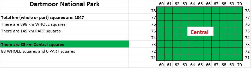 The ‘Central’ area comprises 88 ‘Whole’ and 0 ‘Part’ km squares, which represents 8.4% of the total. The south west corner is SX6071, the north west corner SX6078, the south east corner is SX7071 and the north east corner is SX7078.