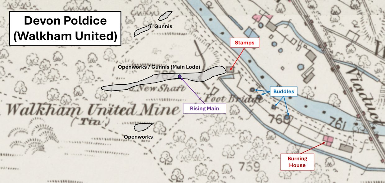 The recorded production figures from 1860 were: 4¾ tons of black tin for £396.9s.4d (or equivalent to over £60,000 in 2026). In 1861, as recorded in the Cornwall and Devon Mining Directory by Williams, the mine was said to be 20 fathoms deep employing 20 persons. Devon Poldice was thought to have been incorporated into a new sett called Walkham and Poldice in the 1860s which included more land near Grenofen Bridge. The mine was recorded as abandoned about 1866, and materials still remained unsold in 1868. That said, the mine was said to be ‘at work’ in 1875 (ref: Brook Index), when it sold 5 tons 11 cwts. 2 qrs. 13lbs. of black tin for £266.10s.0d (or equivalent of nearly £75,000 in 2026)