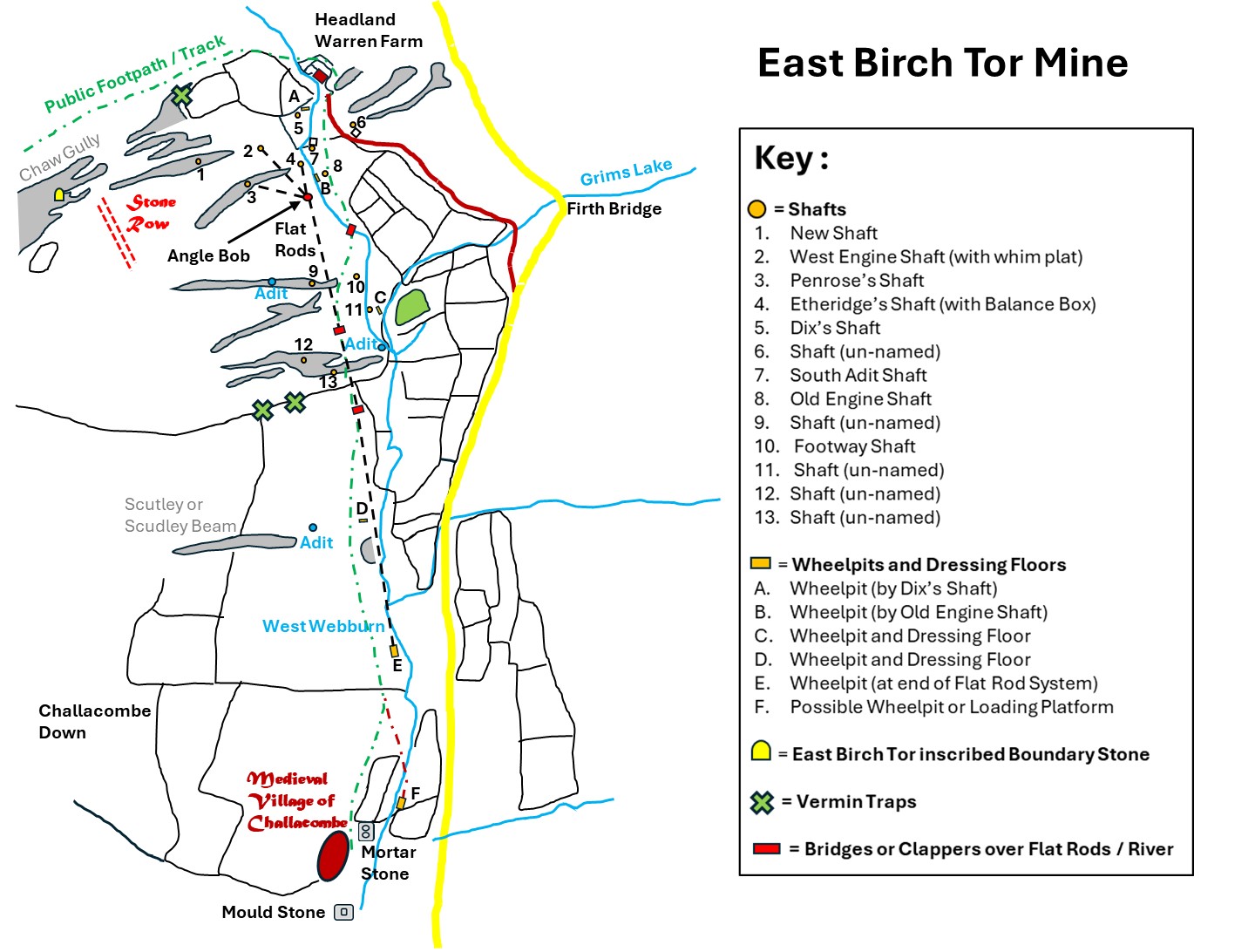 A flat area with low walls / mounds where possibly more mine buildings had been erected. This is in the area of Dix’s Shaft (23 fms). Moss covered walls, possibly old mine buildings. These are located around SX69337 80898Next to where the possible mine buildings are lies a wheelpit. The wheel here was fed by a short leat coming off the West Webburn river. The power generated by this wheel might have been used for draining the nearby shaft. The wheelpit is located at SX69333 80904. This Wheelpit is annotated as ‘B’ on the sketch map in this postJust to the east of the wheelpit is South Adit Shaft at SX69342 80908. The name of the shaft suggests the location of an adit nearby. It is recorded that in 1836, a Captain Paull was supervising the driving of a long cross-cut adit to drain the east-west lodes – if there was an adit near to this location, it is certainly and contender for the location of the adit from 1836To the west of the wheelpit and South Adit Shaft is Etheridge’s Shaft which has an associated Balance Box. The author has agonised as to whether to publish this picture due it showing a clear fly tip and its location may cause embarrassment to those who placed these items here. The author has decided to publish this picture on the basis of it being an industrial archaeology artefact and is a part of the history of the East Birch Tor Mine story.In June 1856, Etheridge’s shaft was reported as being 24 fathoms deep. This shaft is considered to be the deepest at the mineA Balance Box at Etheridge’s Shaft showing the granite wall lining. It is located at SX69307 80922. The details of production of East Birch Tor mine were estimated by D.G Broughton (1968/9 – The Birch Tor and Vitifer Tin Mining Complex) as being only around 55 tons of black tine between 1848 and 1864, which were the most active period of the mine.The balance box in October 2025, still overgrown from the summerEtheridge’s Shaft and Balance Box looking north.West Engine Shaft was possibly sunk between April 1852 – December 1860West Engine Shaft has a distinct tree nowadays and is located at SX69232 80965West Engine Shaft (as the name ‘Engine’ implies) was drained using a flat rod system. The Shaft is annotated as number ‘2’ on the post sketch mapNext to West Engine Shaft is a distinct flat area which was probably a whim plat. The centre has a depression, which would probably have been where the melior stone was located. The location is SX69238 80965From the West Engine Shaft looking towards Headland Warren Farm and Hookney Tor beyondA view across the workings and shafts to the south of Headland Warren FarmLeading up to West Engine Shaft is a Flat Rod Channel, which is covered in bracken for 6 months of the yearThe Flat Rods ‘split’ at an Angle Bob, with one section leading to West Engine Shaft and the other to Penrose Shaft and Etheridge Shaft as shown on the sketch map associated with this post. Of historical note is that on 27th November 1847 John Offord recorded : “there are three waterwheels – one 30 ft. in diameter, attached by 370 fathoms (0.42 mile) of flat-rods to work in the engine-shaft, by which the mine is pumped; the others stamping wheels. All necessary materials for the present effective working of the mine are there. The engine-shaft, which is well placed for the first, third and fourth lodes, is down 24 fathoms from grass, and the lodes opened upon 70 or 80 fathoms”.