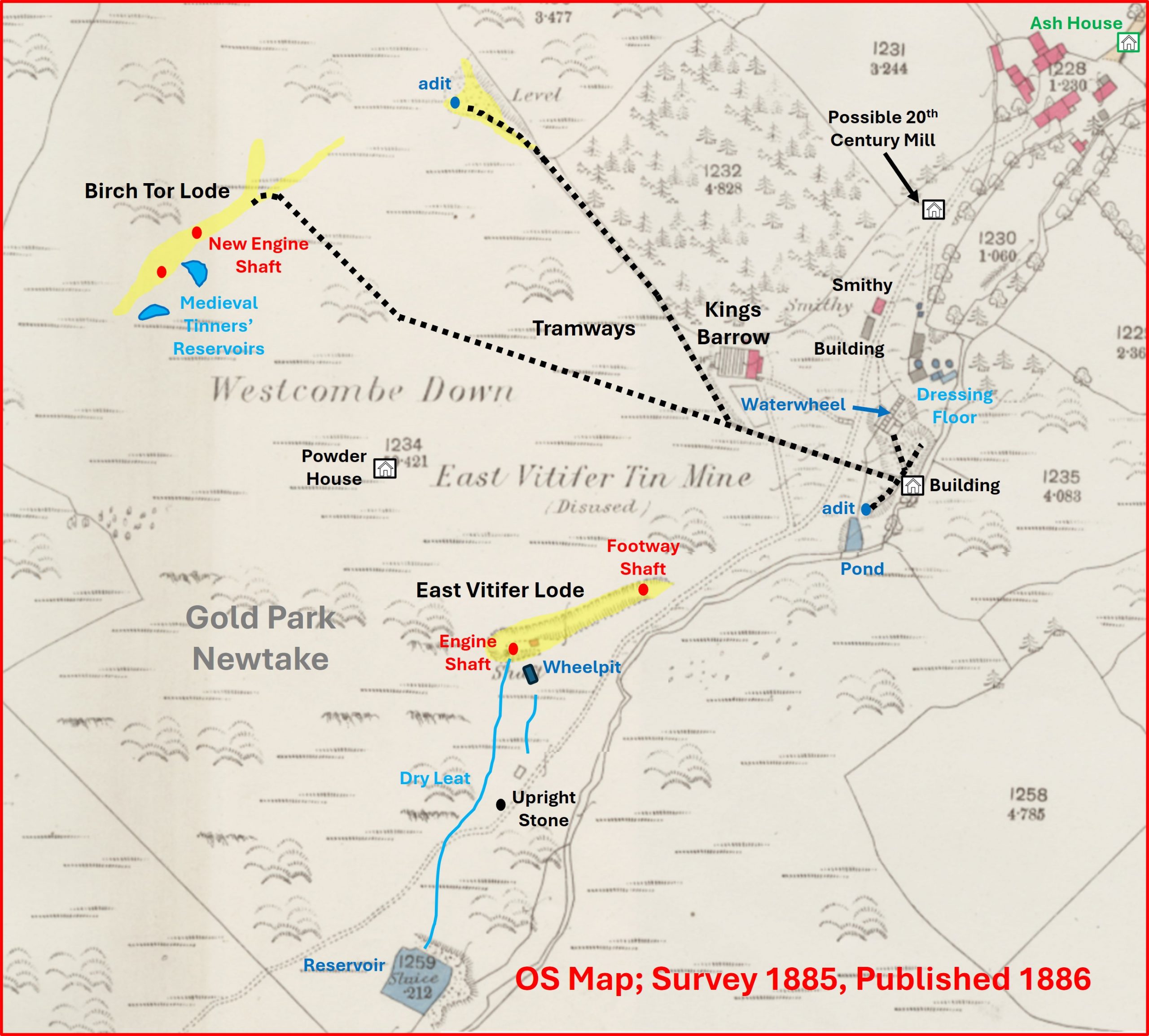 This sketch map is the authors (amateur) interpretation of the mine layout using the OS 1873-1888 map as a guide and from a plan of East Vitifer Mine extracted from THE BIRCH TOR & VITIFER MINING COMPLEX – By D.G. Broughton.