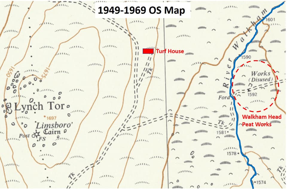 This 1949-1969 map shows the (overlay) location of the turf house & the depicted location of the Walkham Head Peat Works. The tracks / turf roads that encircle Lynch Tor were differentiated by Crossing (Guide to Dartmoor); northern track served the commercial peat works, whereas the southern track was used by the peat cutters in the days of Wheal Betsy