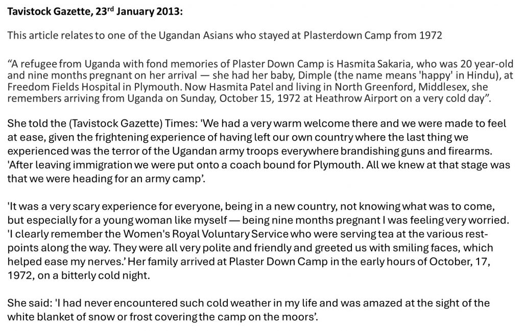 Aerial photograph from 1946 of sections 11, 12 and 13Approx view of the black and white photograph as taken in November 2025Zoomed in aerial view of the ‘Nurses Area’Zoomed in aerial view from the north east corner of the campThis faint line was either a walkway in the nurses area or where the sewerage was runBy the north east gate is a drainThe north east gate in November 2025 is now a small car parkRoad which ran across the nurses areaNext to the camp boundary there is a concrete pipe at SX52091 72510. Could this have been a sewerage pipe as the sewerage buildings are not that far awaySection 14 comprises two tanksThe two depressions of the tanks are still evident. Were these fuel tanks?The depression of tank 1 at SX52013 72465The depression of tank 2 at SX52026 72472Tank 2 looking northThe sewerage area – section 15The sewerage area in October 2025Faint remains of the boundary road at the south east side of the campUsing the National Library of Scotland Maps, the author has recorded the National Grid Reference (NGR) for the centre of every building / feature shown on the previously annotated maps for sections 11 through 15. In total there were in excess of 150 buildings / features across the campAlong the south east wall of the camp there are at least a dozen locations where debris from the camp has been used to repair and maintain the wallCamp debris next to the Whitchurch Bounds, boundary stoneMore debris used in the wallWall repairsWall repairsWall repairsWall repairsWall repairsWall repairsWall repairs by gate with a brick ‘lump’ which might be used to wedge the gate openWall repairsWall repairsThis roofing at Fullamoor Farm may well have come from Plasterdown CampThis debris and foundations of a former building at Fullamoor Farm may well have come from Plasterdown CampPipe outlet near a modern car park, where the water would have (re) entered the original course of the Grimstone and Sortridge LeatClose up of the outletThe Annual Camp of the 4th Battalion Oxfordshire and Buckinghamshire Light Infantry (TA), which took place at Plasterdown in 1956. There were 50 officers, 135 volunteers and 220 National Servicemen.General Sir George W. E. J. Erskine of Southern Command paid a flying visit by helicopter to the camp in 1956. The article from which this photograph was taken suggests there was a ‘sheep pat’ on to which the General had to step on on alighting from the helicopter which was ‘thanks, to the last minute arrangements of the native population of Plasterdown’A Scottish Territorial Unit from late 1950s marching to Plasterdown Camp – picture courtesy of Jill FitzsimmonsFrom a report in ‘The Abingdonian’ (a school publication by Abingdon School) the details of their Combined Cadet Force (C.C.F) camp in 1963 can be summarised as follows: On the first day they went shooting; on the second day, they embarked on a 72-hour Arduous Training exercise (initially in sunshine so hot that two Cadets suffered from heat exhaustion, and one of them had to drop out of the exercise). The exercise had to be abandoned due to mist on the following day, when one patrol got lost! The camp didn’t appear to get any better as they had planned to hold the open air drumhead service which was cancelled due to the mist then on the final day an exercise in fighting patrols was curtailed due to a army regular officer failing to show up. The person who wrote the article about the camp signed off on a positive by saying “All in all, though, a smooth-running, pleasant camp, which served very well as a “digestif” at the end of a crowded term”. Picture courtesy of John Stickland – taken in 1966Princess Royal (the then Princess Anne) visiting the camp in 1962Princess Royal then Princess Anne visiting the camp in 1962. She was visiting the Women Royal Army CorpHelicopter was from 66 Squadron, RAF Seletar. The helicopter is a Bristol type 192 Belvedere. This helicopter built in 1961 and was scrapped in 1969Picture from the camp from 1966. The author believes ‘WOI’ abbreviation is for Warrant Officer (First Class), the highest non-commissioned rank in the British Army and Navy. In October 1972, initially 450 then another 150 Ugandan Asians were housed as part of resettling them, as they escaped persecution in their own country. They were given only 90 days by the dictator Idi Amin to leave their own country. This article is the story of one of the Ugandan refugees talking about the legacy: The ‘Trauma’ Legacy of Amin, Very Few Ugandan Asians Talk AboutYoung Ugandan refugeesAn interesting account from a Ugandan refugee recorded by Tavistock Gazette Times in 2013