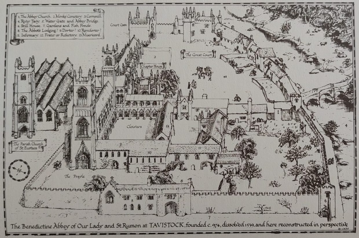 This annotated 19th century map, shows the location of the North Tower (or Porch) of the Abbey Chapel. It is set back from Abbey Place and behind Bedford Hotel so is easily missed. This map depicts a vastly different scene from what would have been here 300 years earlierTavistock’s Bendedictine Abbey must have been quite an impressive sight. Today, not much is immediately recognisable from this picture. However, on closer inspection the observant will find: Court Gate, Trowte’s Tower, south precinct wall, Still Tower, Betsy Grimbal’s Tower, small remnants of cloisters, Abbey Bridge, St. Eustace parish church, the Abbey Chapel and its entrance tower (porch). Brief History of the Abbey: Some historians believe Tavistock Abbey was founded in 961 by Ordgar, Ealdorman of Devon, but the general modern consensus is that it was wholly the foundation of his son Ordwulf in 974. The abbey church (between St. Eustace Church and where the Bedford Hotel now stands), was destroyed by Danish raiders in 997 and rebuilt under Lyfing, the second abbot. The church was further rebuilt in 1285 and the greater part of the abbey between 1457 and 1458. However, on 3rd March 1539 the last abbot, John Peryn, together with twenty monks, surrendered the Abbey to the King as part of the dissolution of the monasteries. They were granted a pension of a hundred pounds. This obviously led to the destruction of what must have been magnificent buildings. There is some rather impressive AI interpretations of the Abbey by Dan Massey which can be found here: https://www.facebook.com/groups/TavistockParish/permalink/2833096586895804/This Tower (or Abbey Porch) is the main focus in this post. The 21st century view of the Tower (right) and the entrance to the Abbey Chapel (left). Before 1845 access to the Abbey Chapel was only through the Tower (Abbey Porch). As can be seen in the photograph this has been changed with an ornate entrance doorway. The ‘new’ doorway uses a re-cycled granite arch of the former water-gate entrance of the abbey which was inserted into the east wall of the Chapel to become the main entrance we use today. The access to the tower (Abbey Porch) is less ornate and was the result of a late 1960s ‘knock through’.These plaques tell the story of the Misericord which became the Abbey Chapel. The Misericord (or infirmary dining hall) was built as a dining hall for the sick. The monks had strict dietary rules which were relaxed for those who were unwell. Thus apparently lead to monks and others to dine more frequently here (with relaxed dietary rules), rather than in the refractory (ref: Johnie’s Meanderings)Blue plaque explaining some of the history of the Abbey ChapelThe seal of Tavistock Abbey is from a lease of 1542, just three years after the surrendering of the Abbey to the King as part of the dissolution of the monasteries. It shows St Mary with the infant Jesus seated on her lap, with a mitred abbot seated below, all surrounded by the legend: SIGILLUM ECCLESI(A)E S(AN)C(TA)E MARI(A)E ET S(AN)C(T)I RUMONI TAVISTOCK (“seal of the Church of Saint Mary and of Saint Rumon of Tavistock”). The coat of arms on the right from the Abbey can be found at Brent Tor church and will be seen later in this post on the vaulted ceiling of the Tower (Abbey Porch)The story of the Abbey Porch with its ‘vaulted ceiling and bosses’ begins in 1513 when Richard Banham, Abbot of Tavistock was working to become a Spiritual Lord of Parliament. This offended Hugh Oldham, the Bishop of Exeter and by April that year, the Abbot had been summoned to answer for his contempt. However, his answer was found to be unsatisfactory and the Bishop excommunicated him the following week. The picture is the Banham coat of arms