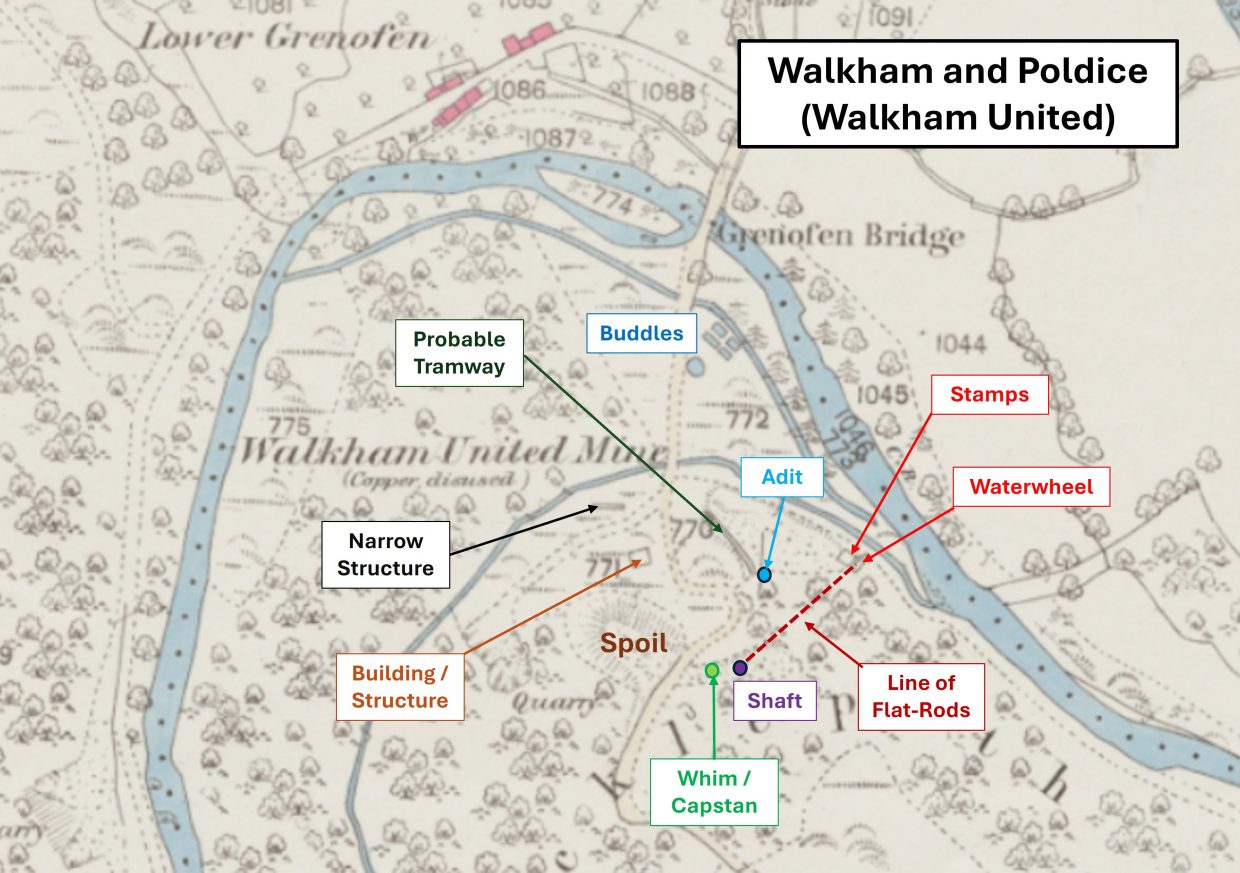 The 19th century mine called Walkham and Poldice, which later in the century became part of Walkham United, is located to the south of Grenofen bridge where the River Walkham takes a 180 degree change in direction from initially a northerly direction to a southerly direction about a mile before it flows into the River Tavy and Double Waters.